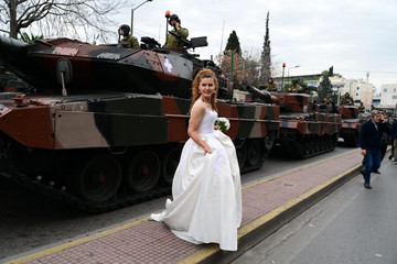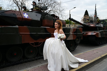 Μια απρόσμενη στιγμή εκτυλίχθηκε στην παρέλαση της 25ης Μαρτίου, όταν μια νύφη, φορώντας το παραδοσιακό της νυφικό, πόζαρε μπροστά από τα άρματα μάχης στη λεωφόρο Αμαλίας, ακριβώς πριν την έναρξη της στρατιωτικής παρέλασης.