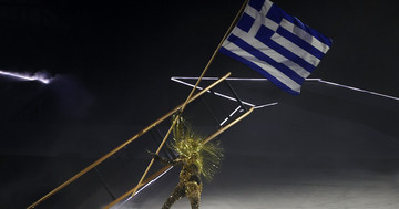 Κατεβαίνοντας από την οροφή του σταδίου ο «χρυσός εξερευνητής», εμπνευσμένος, από πολλές αναφορές από τη γαλλική ιστορική κληρονομιά, ξεκινώντας από την ιδιοφυΐα της Βαστίλης, καθώς και από πλάσματα της επιστημονικής φαντασίας και βιντεοπαιχνίδια. Στην εκεί εξερεύνησή του του παραδόθηκε η ελληνική σημαία υπό το άκουσμα του εθνικού μας ύμνου.