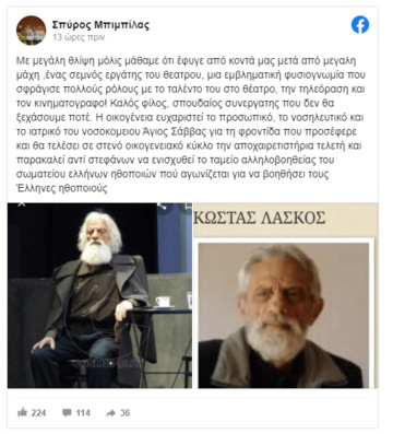 “Με μεγάλη θλίψη μόλις μάθαμε ότι έφυγε από κοντά μας μετά από μεγάλη μάχη, ένας σεμνός εργάτης του θεάτρου, μια εμβληματική φυσιογνωμία που σφράγισε πολλούς ρόλους με το ταλέντο του στο θέατρο, την τηλεόραση και τον κινηματογραφο! Καλός φίλος, σπουδαίος συνεργάτης που δεν θα ξεχάσουμε ποτέ.