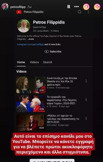 «Αυτό είναι το επίσημο κανάλι μου στο Youtube. Μπορείτε να κάνετε εγγραφή για να βλέπετε πρώτοι ακυκλοφόρητο περιεχόμενο και άλλα στιγμιότυπα», έγραψε στη νέα του ανάρτηση ο Πέτρος Φιλιππίδης.