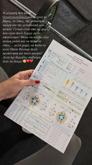 Δημοσίευσε, μάλιστα, τα αποτέλεσμα της μέτρησής της σε ένα story στον προσωπικό της λογαριασμό στο Instagram, αποκαλύπτοντας πόσα κιλά είναι, πόσο τις 100 λίπος έχει στο σώμα της και την μυϊκή της μάζα, εξηγώντας τι οδηγίες της έδωσε η διατροφολόγος της.