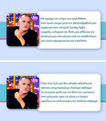 «Είμαστε υπέρ της ισότητας όλων των ανθρώπων από όπου και εάν προέρχονται, είτε έχει να κάνει με άντρα ή γυναίκα. Νομίζω ότι δεν χρειάζεται μέσα από τις ατελείωτες ώρες που είμαστε στον αέρα, να εξηγήσω ότι η αλήθεια του καθενός φαίνεται, και το τι πιστεύει και το τι πρεσβεύει.»