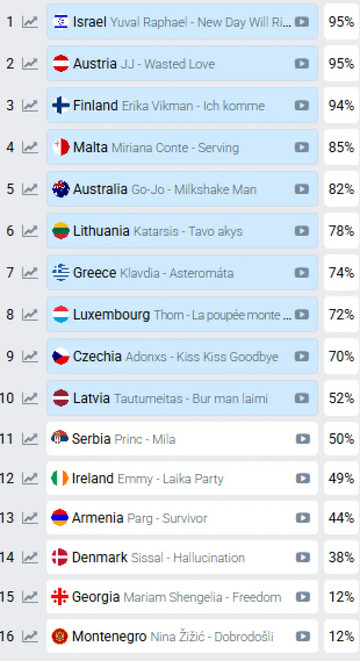 Οι πρώτες ενδείξεις από τα προγνωστικά δείχνουν την Ελλάδα να βρίσκεται στην 7η θέση, ενώ το Ισραήλ προηγείται στην 1η θέση, με τη Φινλανδία να κατατάσσεται πρώτη στη ψηφοφορία του κοινού, ακολουθούμενη από την Ελλάδα στην 10η.