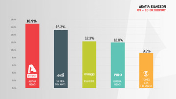 Ενδεικτικά για την εβδομάδα 3-10 Οκτωβρίου, το δελτίο ειδήσεων βρέθηκε στην πρώτη θέση με ποσοστό 16.9% σε μέσο όρο του γενικού πληθυσμού, εδραιώνοντας τον Αlpha στην ζώνη των 8 για μια ακόμη χρονιά.