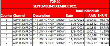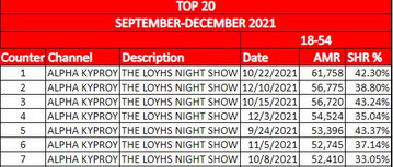 Η διαχρονική επιτυχία φαίνεται στην επιλογή κάθε εβδομάδας κατακτόντας άνετα τις 7 πρώτες και πιο σημαντικές θέσεις του πίνακα τηλεθέασης με τα πιο επιτυχημένα προγράμματα της περιόδου Σεπτέμβριος – Δεκέμβριος 2021.
