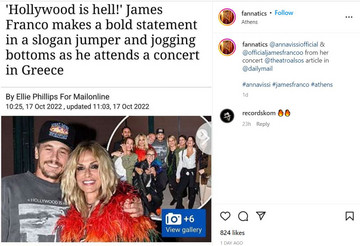 «Το Χόλιγουντ είναι κόλαση», ανέφερε ο διάσημος ηθοποιός με στάμπα στην μπλούζα που επέλεξε να φορέσει στην εν λόγω συναυλία της Άννας Βίσση, ενώ οι δυο τους φωτογραφήθηκαν αγκαλιασμένοι και χαμογελαστοί με την ιστοσελίδα να δημοσιεύει τις εικόνες.