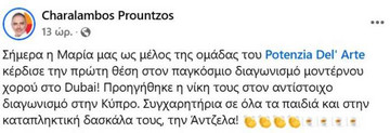 Η Μαρία, η ταλαντούχα κόρη του Δημάρχου Λευκωσίας Χαράλαμπου Προύντζου και της δημοσιογράφου Γωγώς Αλεξανδρινού, κατέκτησε την πρώτη θέση στον Παγκόσμιο Διαγωνισμό Χορού UDO 2025 στο Ντουμπάι.