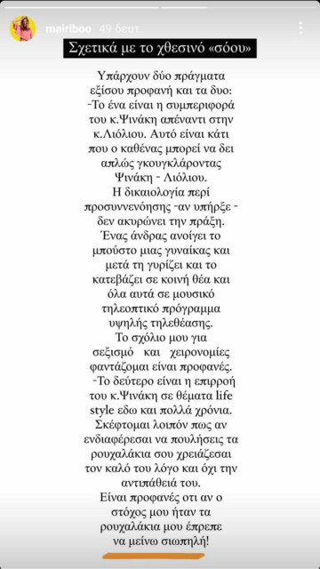 «Σχετικά με το χθεσινό “σόου”. Υπάρχουν δυο πράγματα εξίσου προφανή και τα δυο: Το ένα είναι η συμπεριφορά του κ.Ψινλακη απέναντι στην κα. Λιόλιου. Αυτό είναι κάτι που ο καθένας μπορεί να δει απλώς γκουγκλάροντας, Ψινάκη-Λιόλιου. Η δικαιολογία περί προσυνεννόησης – αν υπήρξε – δεν ακυρώνει την πράξη.