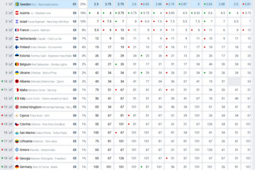 Εντυπωσιακό είναι το γεγονός ότι, παρά τις πτώσεις των δύο χωρών, οι στοιχηματικές αποδόσεις για την πρώτη θέση παραμένουν αμετάβλητες. Η Σουηδία συνεχίζει να κατέχει την πρωτοκαθεδρία με ποσοστό νίκης 25%, ενώ ακολουθούν η Αυστρία και το Ισραήλ με 18% και 10% αντίστοιχα.