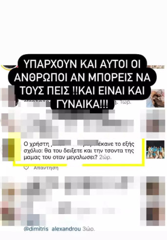 Αυτό έκανε και χθες, Δευτέρα 3/10 ο Δημήτρης Αλεξάνδρου, ο οποίος δημοσίευσε μια φωτογραφία με ένα προσβλητικό σχόλιο που δέχτηκε και τον εξόργισε. Συγκεκριμένα, ο ακόλουθός του αναφέρθηκε στο ροζ βίντεο της Ιωάννα Τούνη που είχε διαρρεύσει, με τον Δημήτρη Αλεξάνδρου να απαντά: «Υπάρχουν και αυτοί οι άνθρωποι, αν μπορείς να τους πεις. Και είναι και γυναίκα».