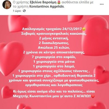 «Απολογισμός τροχαίου 24/12/2017. Σοβαρές κρανιοεγκεφαλικές κακώσεις, 2 μήνες εντατική, 2 διασωληνωσεις, Απώλεια 25 κιλών, 2 χρόνια σε κέντρο αποκατάστασης, 7 χειρουργεία στο κεφάλι, 1 χειρουργείο στα μάτια 1 χειρουργείο στο λαιμό, 1 χειρουργείο στους αχίλλειους τένοντες , 1 χειρουργείο στο χέρι , ορθοδοντική θεραπεία 2 χρόνων και φυσικά συνεχίζουμε με φυσικοθεραπείες, εργοθεραπειες και λογοθεραπειες Κι όμως είσαι ακόμα εδώ και το παλεύεις… είσαι Μαχητής Κωνσταντίνε μου γι’αυτο Σ’ΑΓΑΠΩ!!»