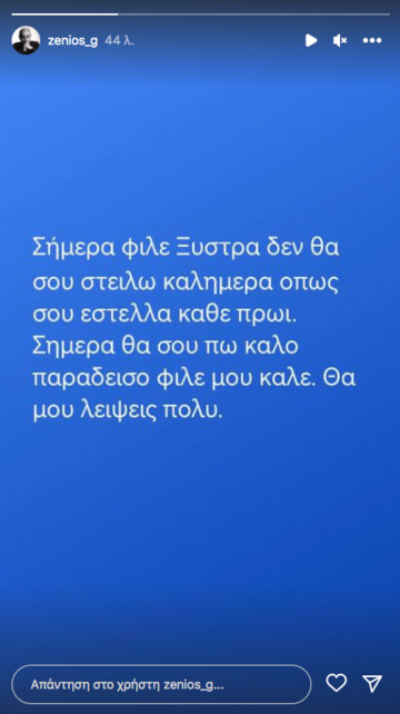 «Σήμερα φίλε Ξύστρα δεν θα σου στείλω καλημέρα όπως σου έστελνα κάθε πρωί. Σήμερα θα σου πω καλό παράδεισο φίλε μου καλέ. Θα μου λείψεις πολύ», έγραψε χαρακτηριστικά ο Γιώργος Ζένιος.