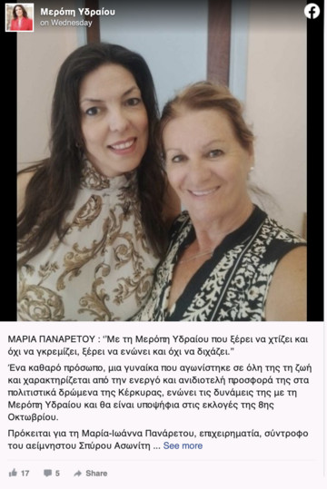 . Στις δημοτικές εκλογές αποφάσισε να συμμετάσχει και η μητέρα του Σάκη Ρουβά καθώς θα είναι υποψήφια με την νυν δήμαρχο Κέρκυρας, Μερόπη Υδραίου.