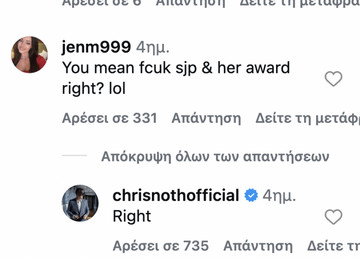 Πιο συγκεκριμένα, ο Κρις Νοθ ανέβασε φωτογραφία από το γυμναστήριο, γράφοντας στη λεζάντα κάτι σχετικό με τη νέα χρονιά: «Γ@μώ τα νέα χρόνια. Πάμε». Ωστόσο, σχόλιο ενός χρήστη έφερε στην επιφάνεια μια κόντρα -ίσως μονόπλευρη. Ο χρήστης έγραψε «Εννοείς για τη Σάρα Τζέσικα Πάρκερ και το βραβείο της, σωστά;», με τον Κρις Νοθ να απαντά «σωστά».