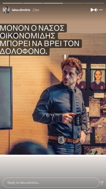 Πιο συγκεκριμένα ο Δημητρης Λάλος ανέβασε στα instastories μια φωτογραφία από τη σειρά «Σιωπηλός Δρόμος» που υποδύθηκε τον ντεντέκτιβ Νάσο Οικονομίδη. Ο ίδιος σχολιάζοντας με χιούμορ τον χαμό που έχει δημιουργηθεί με τη δολοφονία και τον φονιά του Στεφανή, έγραψε με χιούμορ: «Μόνο ο Νάσος Οικονομίδης μπορεί να βρει τον δολοφόνο».