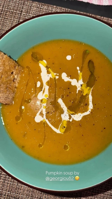 Ο Ανδρέας Γεωργίου ετοίμασε μια αρωματική κολοκυθόσουπα, την οποία συνόδευσε με φρεσκοψημένο ψωμί και μια πινελιά γιαουρτιού ή κρέμας γάλακτος, χαρίζοντας στο πιάτο μια απολαυστικά βελούδινη υφή.