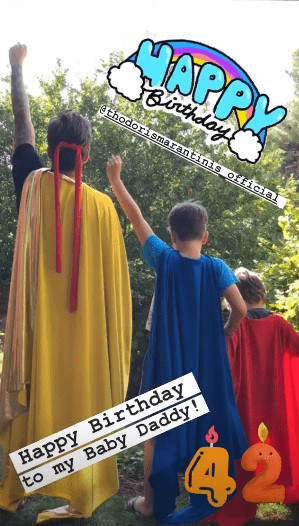 Στην φωτογραφία απεικονίζονται τα δυο παιδιά τους με τον πατέρα τους, με την πλάτη στην φωτογραφική φορώντας κάπες και σηκώνοντας την γροθιά τους σαν τον superman. Επίσης έχει γράψει στο στιγμιότυπο «Happy birthday to my baby daddy» και ένα αυτοκόλλητο με αριθμό 42 που φανερώνει και την ηλικία του γνωστού τραγουδιστή.