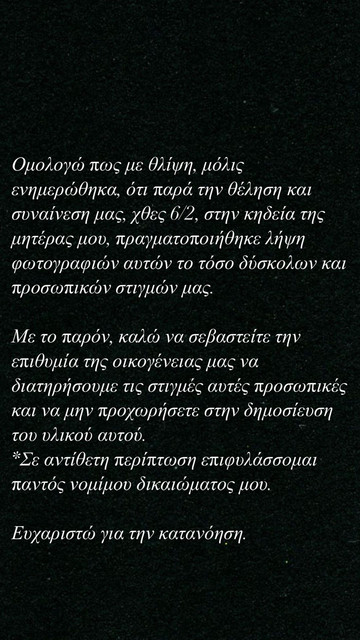 Στη συνέχεια όμως η παρουσιάστρια προχώρησε και σε νέα ανάρτηση μέσω της οποίας έκανε έκκληση να μην δημοσιεύθουν οι φωτογραφίες που τραβήχθηκαν χωρίς την συναίνεση της οικογένειας.