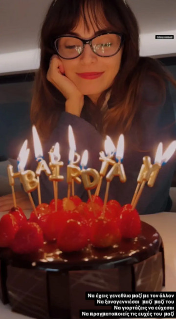 Στις φωτογραφίες η ηθοποιός ποζάρει χαμογελαστή πάνω από την τούρτα της. Ο Αργύρης Πανταζάρας έγραψε στη λεζάντα της ανάρτησης: «Να έχεις γενέθλια με τον άλλον, να ξαναγεννιέσαι μαζί του, να γιορτάζεις, να εύχεσαι να πραγματοποιείς τις ευχές του».