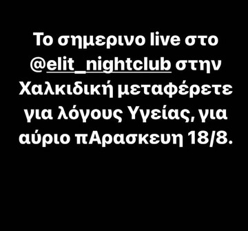 «Το σημερινό Live στη Χαλκιδική μεταφέρεται για λόγους υγείας, για αύριο Παρασκευή 18/8» έγραψε στην ανάρτησή του ο Snik.