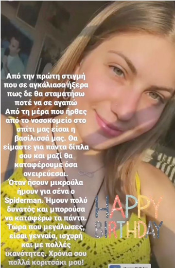 «Από την πρώτη στιγμή που σε αγκάλιασα ήξερα πως δε θα σταματήσω ποτέ να σε αγαπώ. Από τη μέρα που ήρθες από το νοσοκομείο στο σπίτι μας είσαι η βασίλισσά μας. Θα είμαστε για πάντα δίπλα σου και μαζί θα καταφέρουμε όσα ονειρεύεσαι. Όταν ήσουν μικρούλα ήμουν για σένα ο Spiderman. Ήμουν πολύ δυνατός και μπορούσα να καταφέρω τα πάντα. Τώρα πο μεγαλώνεις, είσαι γενναία, ισχυρή και με πολλές ικανότητες. Χρόνια σου πολλά κοριτσάκι μου», έγραψε ο Σοφοκλής Κασκαούνιας.