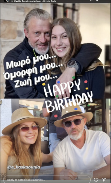 Συγκεκριμένα, ο Σοφοκλής Κασκαούνιας δημιούργησε ένα collage με δυο φωτογραφίες τους γράφοντας: “Μωρό μου, ζωή μου, ομορφή μου χρόνια πολλά” και συνοδεύοντας την ανάρτηση του με το τραγούδι του Βασίλη Παπακωνσταντίνου “Χρόνια Πολλά”.