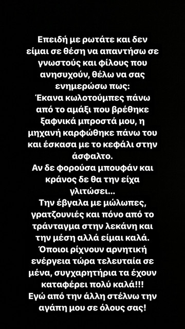 Την έβγαλα με μώλωπες, γρατζουνιές και πόνο από το τράνταγμα στη λεκάνη και τη μέση αλλά είμαι καλά. Όποιοι ρίχνουν αρνητική ενέργεια τώρα τελευταία σε μένα, συγχαρητήρια, τα έχουν καταφέρει πολύ καλά!! Εγώ από την άλλη στέλνω την αγάπη μου σε όλους σας“.