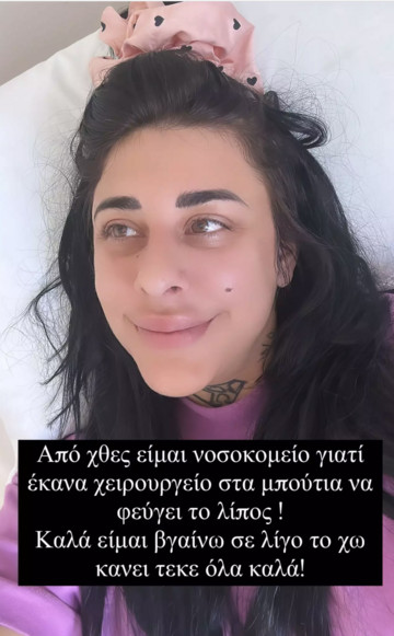«Από χθες είμαι νοσοκομείο γιατί έκανα χειρουργείο στα μπούτια να φύγει το λίπος. Καλά είμαι, βγαίνω σε λίγο, το χω κάνει τεκέ, όλα καλά»έγραψε χαρακτηριστικά στην ανάρτησή της η γνωστή influencer.