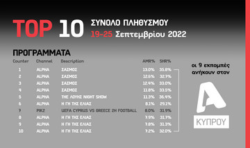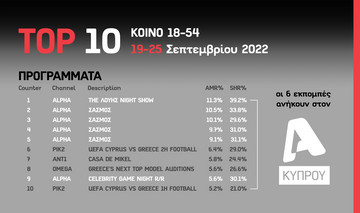 Η επιτυχία της prime time ζώνης και της μυθοπλασίας διαφαίνεται και στα κορυφαία προγράμματα του μήνα. Για την προηγούμενη εβδομάδα το top 10 της κυπριακής τηλεόρασης κατακτήθηκε από τον Alpha, αφού 9 στα 10 πιο επιτυχημένα προγράμματα ανήκουν στο κανάλι. “Λούης Nisght Show” , “Η γη της Ελιάς” και “Σασμός” , σπάνε κάθε ρεκόρ τηλεθέασης με τον κόσμο να αδημονεί για σάτιρα αλλά και δράση.