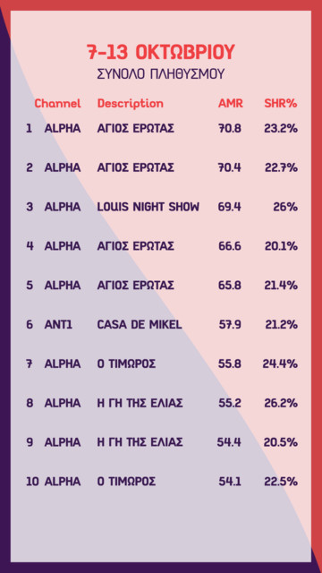 Για την εβδομάδα που μας πέρασε ο “Άγιος έρωτας”, η “Γη της Ελιάς”, ο “Τιμωρός” αλλά φυσικά και το Λούης Night Show μονοπώλησαν το ενδιαφέρον.