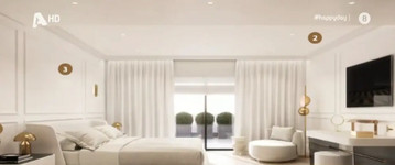 Η σκάλα του hall οδηγεί στην κρεβατοκάμαρα του ζευγαριού, η οποία ακολουθεί την ίδια αισθητική με το υπόλοιπο σπίτι, ενώ, το υπέρδιπλο κρεβάτι στο κέντρο κλέβει την παράσταση. Μάλιστα, έχει δικό του προσωπικό γραφείο, τηλεόραση, αλλά και μπαλκόνι με όμορφη θέα.