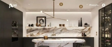 Μάλιστα, στον χώρο φαίνεται να ξεπροβάλλουν και διάφορα χρυσά στοιχεία, όπως τα διακοσμητικά, τα φωτιστικά, και οι λεπτομέρειες που φέρνουν την αίσθηση της χλιδής και την πολυτέλειας στο χώρο. Η τραπεζαρία βρίσκεται στον κοινό χώρο με το καθιστικό, ενώ, στην ευθεία συναντάμε την κουζίνα, η οποία είναι ντυμένη από πάνω μέχρι κάτω με μάρμαρο.