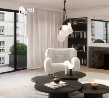 Το καθιστικό είναι διακοσμημένο με μεγάλες λευκές πολυθρόνες και έναν μεγάλο επίσης λευκό καναπέ με μοντέρνο σχέδιο, ενώ, η μονοτωνία «σπάει» μέσα από διάφορα έργα τέχνης που κοσμούν τους τοίχους, από τις μαύρες βιβλιοθήκες και το μαύρο σύγχρονο τζάκι που φτάνει μέχρι το ταβάνι.