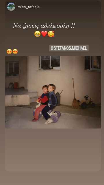 Η Ραφαέλλα Μιχαήλ μοιράστηκε μία φωτογραφία από την παιδική τους ηλικία, με τα δύο αδέλφια να είναι πάνω σε ένα παιχνίδι και να χαμογελάνε στον φακό.