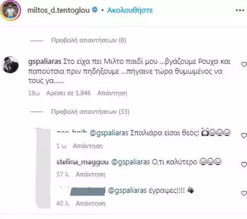 Από τα σχόλια που ξεχωρίζουν ήταν και αυτό του Γιάννη Σπαλιάρα, που του έγραψε στο Instagram: «Στο είχα πει Μίλτο παιδί μου… βγάζουμε ρούχα και παπούτσια πριν πηδήξουμε… πήγαινε τώρα θυμωμένος να τους… ».
