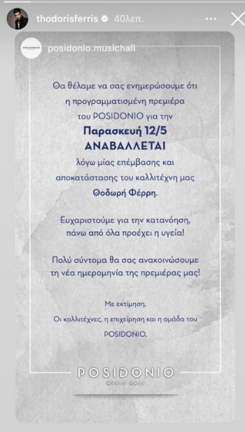 «Θα θέλαμε να σας ενημερώσουμε ότι η προγραμματισμένη πρεμιέρα για την Παρασκευή 12/5 αναβάλλεται λόγω μίας επέμβασης και αποκατάστασης του καλλιτέχνη μας Θοδωρή Φέρρη. Ευχαριστούμε για την κατανόηση, πάνω από όλα προέχει η υγεία! Πολύ σύντομα θα σας ανακοινώσουμε τη νέα ημερομηνία της πρεμιέρας μας!», αναφέρει χαρακτηριστικά η ανακοίνωση του νυχτερινού κέντρου.