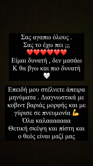 “Σας αγαπώ όλους. Σας το έχω πει;; Είμαι δυνατή, δεν μασάω και θα βγω και πιο δυνατή. Επειδή μου στέλνετε άπειρα μηνύματα. Διαγνώστηκα με covid βαριάς μορφής και με γύρισε σε πνευμονία. Όλα καλααα. Θετική σκέψη και πίστη και ο θεός είναι μαζί μας»,
