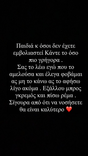 …και στη συνέχεια πρόσθεσε: «Παιδιά και όσοι δεν έχετε εμβολιαστεί. Κάνετε το όσο πιο γρήγορα. Σας το λέω εγώ που το αμελούσα και έλεγα φοβάμαι ας μη το κάνω ας το αφήσω λίγο ακόμα. Εξάλλου μπρος γκρεμός και πίσω ρέμα. Σίγουρα από ότι να νοσήσετε θα είναι καλύτερο”
