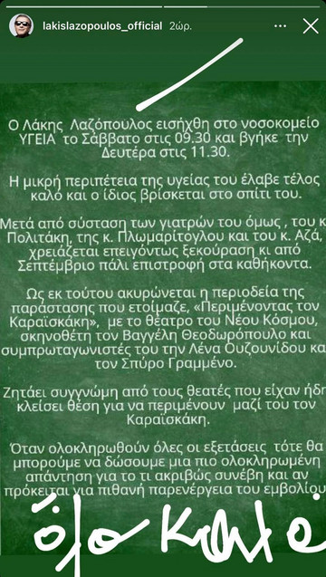 Στην ανάρτησή του στα instastories ο Λάκης Λαζόπουλος ενημερώνει παράλληλα πως η περιοδεία της παράστασης που ετοίμαζε ακυρώνεται και ζητάει συγγνώμη από τους θεατές που είχαν ήδη κλείσει θέση.