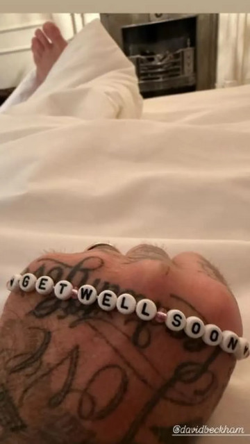 Η 51χρονη σχεδιάστρια μόδας δημοσίευσε μια φωτογραφία του 50χρονου πρώην άσου του ποδοσφαίρου να ποζάρει χαμογελαστός στο κρεβάτι του νοσοκομείου, φορώντας νάρθηκα στο δεξί του χέρι.