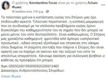 «Τα τελευταία χρόνια η κατάσταση υγείας του Σπύρου μας έχει επιδεινωθεί αρκετά. Τελευταίο περιστατικό , η κολπική μαρμαρυγή που σε συνδυασμό με τα υπόλοιπα προβλήματα υγείας έχουν δυσκολέψει την καθημερινότητα του σε σημείο που δεν μπορεί να μείνει μόνος του ούτε δευτερόλεπτο . Είναι καθηλωμένος. Ο Σπύρος μας χρειάζεται καθημερινή φροντίδα από έμπειρο νοσηλευτικό προσωπικό , ειδικό ιατρικό εξοπλισμό και επισκευές στο οίκημα όπου διαμένει. Η ελάχιστη σύνταξη που παίρνει ο Σπύρος δεν είναι αρκετή για να παρέχει σε εκείνον και την σύζυγο του ούτε τα απολύτως απαραίτητα . Κάνουμε έκκληση για συλλογική βοήθεια ,ο καθένας ας προσφέρει ότι μπορεί.
