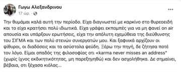 «Την θυμάμαι καλά αυτή την περίοδο. Είχα διαγνωστεί με καρκίνο στο θυρεοειδή και το είχα κρατήσει πολύ ιδιωτικά. Είχα γράψει εκπομπές για να μη φανεί on air απουσία και υπάρξουν ερωτήσεις, είχα την απόλυτη εχεμύθεια της διεύθυνσης του ΣΙΓΜΑ και των πολύ στενών συνεργατών μου. Και ξαφνικά αρχίζουν οι ψίθυροι, οι διαδόσεις και τα ασύστολα ψεύδη. Ξέρω την πηγή, δε ζήτησα ποτέ τον λόγο. Είμαι οπαδός της φιλοσοφίας οτι «karma never misses an address” (χωρίς ίχνος εκδικητικότητας, μη παρεξηγηθώ) και δεν ασχολήθηκα. Δε σημαίνει, βέβαια, οτι ξέχασα κιόλας…», έγραψε η Γωγώ Αλεξανδρινού.