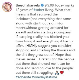 «Σήμερα είναι 12 χρόνια που ζω νηφάλια. Αυτό σημαίνει ότι επιβίωσα στην καραντίνα (με όλα όσα ήρθαν μαζί με αυτή) χωρίς κανένα ποτό, χωρίς να με συλλάβουν για επίθεση και αρχίζοντας μια επιχείρηση. Εάν με το να ξεφεύγεις από την πραγματικότητα σε έχει μπλοκάρει από το να τη ζεις, προτείνω ανεπιφύλακτα να σκεφτείς να σταματήσεις και να μυρίσεις τα λουλούδια και τη βρωμιά που βγάζουν. Ελπίζω αυτό να βγάζει νόημα… Ευγνώμων για τους ανθρώπους εκεί έξω που μου έδειξαν ότι μπορεί να συμβεί και πολλή αγάπη σε εκείνους που ακόμη αγωνίζονται»