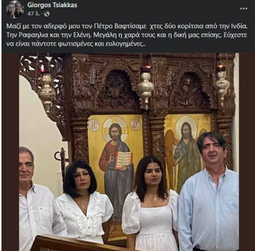 “Μαζί με τον αδερφό μου τον Πέτρο Βαφτίσαμε χτες δύο κορίτσια από την Ινδία. Την Ραφαηλια και την Ελένη. Μεγάλη η χαρά τους και η δική μας επίσης. Εύχεστε να είναι πάντοτε φωτισμένες και ευλογημένες..”.’