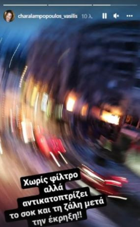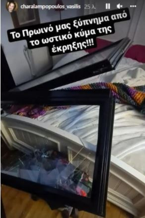 Όχι μόνο έσπασαν τα τζάμια του σπιτιού του, αλλά έπεσαν μαζί και τα κουφώματα. «Το πρωινό μας ξύπνημα από το ωστικό κύμα της έκρηξης», έγραψε πάνω στο πρώτο στιγμιότυπο ο Βασίλης Χαραλαμπόπουλος.