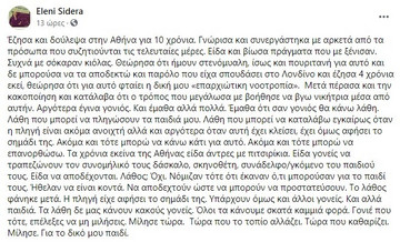 “Έζησα και δούλεψα στην Αθήνα για 10 χρόνια. Γνώρισα και συνεργάστηκα με αρκετά από τα πρόσωπα που συζητιούνται τις τελευταίες μέρες. Είδα και βίωσα πράγματα που με ξένισαν. Συχνά με σόκαραν κιόλας. Θεώρησα ότι ήμουν στενόμυαλη, ίσως και πουριτανή για αυτό και δε μπορούσα να τα αποδεκτώ και παρόλο που είχα σπουδάσει στο Λονδίνο και έζησα 4 χρόνια εκεί, θεώρησα ότι για αυτό φταίει η δική μου «επαρχιώτικη νοοτροπία». Μετά πέρασα και την κακοποίηση και κατάλαβα ότι ο τρόπος που μεγάλωσα με βοήθησε να βγω νικήτρια μέσα από αυτήν. Αργότερα έγινα γονιός. Και έμαθα αλλά πολλά. Έμαθα ότι σαν γονιός θα κάνω λάθη. Λάθη που μπορεί να πληγώσουν τα παιδιά μου. Λάθη που μπορεί να καταλάβω εγκαίρως όταν η πληγή είναι ακόμα ανοιχτή αλλά και αργότερα όταν αυτή έχει κλείσει, έχει όμως αφήσει το σημάδι της. Ακόμα και τότε μπορώ να κάνω κάτι για αυτό. Ακόμα και τότε μπορώ να επανορθώσω. Τα χρόνια εκείνα της Αθήνας είδα άντρες με πιτσιρίκια. Είδα γονείς να τραπεζώνουν τον συνομήλικό τους δάσκαλο, σκηνοθέτη, συνάδελφο/γκόμενο του παιδιού τους. Είδα να αποδέχονται. Λάθος; Όχι. Νόμιζαν τότε ότι έκαναν ό,τι μπορούσαν για το παιδί τους. Ήθελαν να είναι κοντά. Να αποδεχτούν ώστε να μπορούν να προστατεύσουν. Το λάθος φάνηκε μετά. Η πληγή είχε αφήσει το σημάδι της. Υπάρχουν όμως και άλλοι γονείς. Και αλλά παιδιά. Τα λάθη δε μας κάνουν κακούς γονείς. Όλοι τα κάνουμε σκατά καμμιά φορά. Γονιέ που τότε, επέλεξες να μη μιλήσεις. Μίλησε τώρα. Τώρα που το τοπίο αλλάζει. Τώρα που καθαρίζει. Μίλησε. Για το δικό μου παιδί”