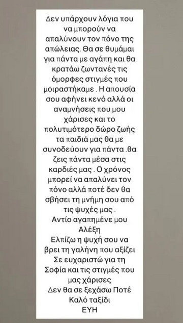 «Δεν υπάρχουν λόγια που να μπορούν να απαλύνουν τον πόνο της απώλειας. Θα σε θυμάμαι για πάντα με αγάπη και θα κρατάω ζωντανές τις όμορφες στιγμές που μοιραστήκαμε. Η απουσία σου αφήνει κενό αλλά οι αναμνήσεις που μου χάρισες και το πολυτιμότερο δώρο της ζωής, τα παιδιά μας θα με συνοδεύουν για πάντα.
