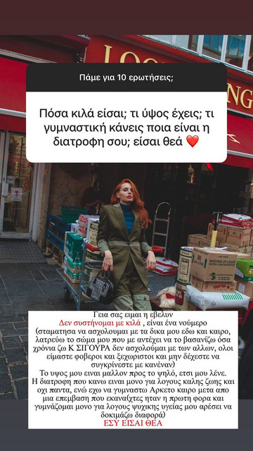 Γεια σας είμαι η Έβελυν. Δεν συστήνομαι µε κιλά, είναι ένα νούμερο (σταμάτησα να ασχολούμαι µε τα δικά µου εδώ και καιρό, λατρεύω το σώμα µου που µε αντέχει να το βασανίζω όσα χρόνια ζω και σίγουρα δεν ασχολούμαι µε των άλλων, όλοι είμαστε φοβεροί και ξεχωριστοί και µην δέχεστε να συγκρίνεστε µε κανέναν). Το ύψος µου είναι μάλλον προς το ψηλό, έτσι µου λένε. Η διατροφή που κάνω είναι μόνο για λόγους καλής ζωής και όχι πάντα, ενώ έχω να γυμναστώ αρκετό καιρό, μετά από µια επέμβαση που έκανα( χτες ήταν η πρώτη φορά και γυμνάζομαι μόνο για λόγους ψυχικής υγείας µου αρέσει να δοκιμάζω διαφορά) ΕΣΥ ΕΙΣΑΙ ΘΕΑ”