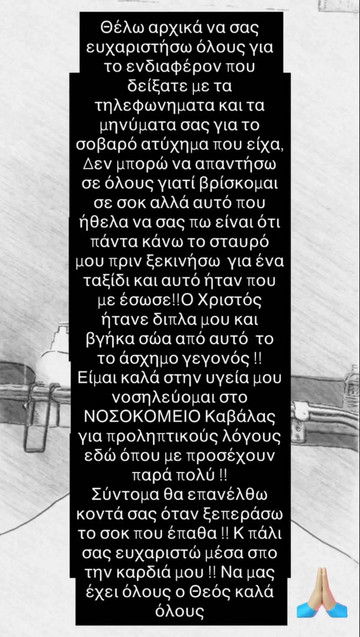 «Θέλω αρχικά να σας ευχαριστήσω όλους για το ενδιαφέρον που δείξατε με τα τηλεφωνήματα και τα μηνύματά σας για το σοβαρό ατύχημα που είχα. Δεν μπορώ να απαντήσω σε όλους γιατί βρίσκομαι σε σοκ αλλά αυτό που ήθελα να σας πω είναι ότι πάντα κάνω το σταυρό μου πριν ξεκινήσω για ένα ταξίδι και αυτό ήταν που με έσωσε!! Ο Χριστός ήταν δίπλα μου και βγήκα σώα από αυτό το άσχημο γεγονός!!».