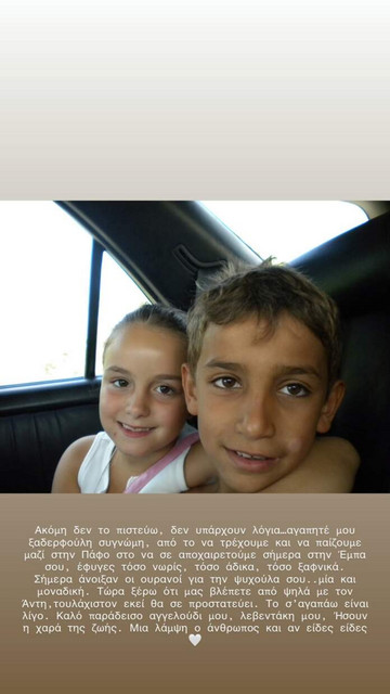 «Ακόμη δεν το πιστεύω, δεν υπάρχουν λόγια… αγαπημένε μου ξαδερφούλη συγγνώμη, από το να τρέχουμε και να παίζουμε μαζί στην Πάφο στο να σε αποχαιρετούμε σήμερα στην Έμπα σου, έφυγες τόσο νωρίς, τόσο άδικα, τόσο ξαφνικά. Σήμερα άνοιξαν οι ουρανοί για την ψυχούλα σου… μία και μοναδική. Τώρα ξέρω ότι μας βλέπετε από ψηλά με τον Άντη, τουλάχιστον εκεί θα σε προστατεύει. Το σ’ αγαπώ είναι λίγο. Καλό παράδεισο αγγελούδι μου, λεβεντάκι μου. Ήσουν η χαρά της ζωής. Μια λάμψη ο άνθρωπος και αν είδες είδες».